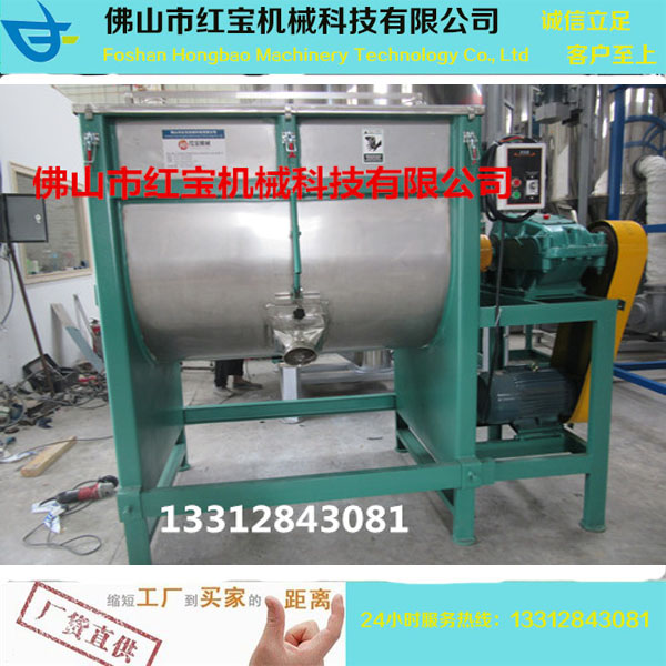 1000KG卧式球速体育在线客服由安装于搅拌轴上的内外径螺旋带动桶体内物料,使搅拌器在桶体内最大范围翻动物料.搅拌器结构上,螺旋设计成内外,左右互为反螺旋,搅拌器工作时内螺旋带动靠近轴心处物料做轴心旋转,轴向由内至两侧推动,外螺旋带动靠近桶壁物料做轴心旋转,轴向由两侧至内推动,于是造成物料在桶体内对流循环、剪切渗混,完成物料在较短时间内快速均匀混合.